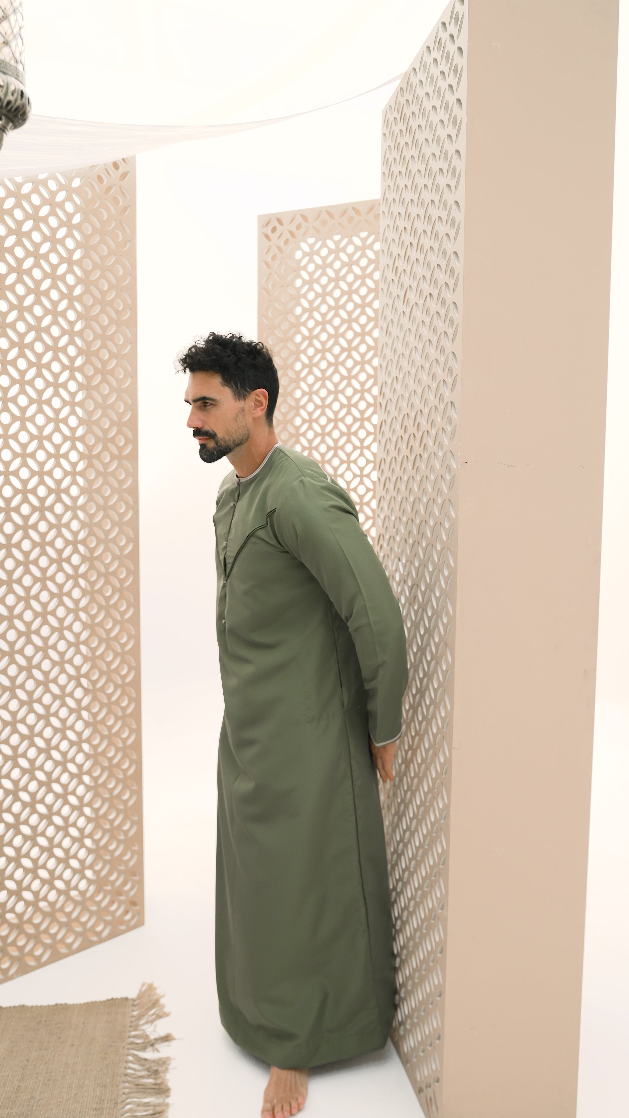 Emirati Mens Olive Thobe - An earthy green reminiscent of olive trees that have stood the test of time, this thobe signifies endurance, faith, and restoration. Just as nature renews itself with each season, this mens thobe is a symbol of strength through patience, a reminder that growth begins with faith.